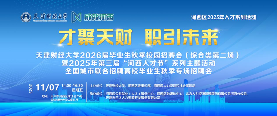 11月7日下午,由我校与河西区委组织部、河西区人力资源和社会保障局联合主办的天津财经大学2026届毕业生秋季校园招聘会(综合类第二场)暨2025年第三届“河西人才节”系列主题活动全国城市联合招聘高校毕业生秋季专场招聘会于学校G座东厅成功举办。