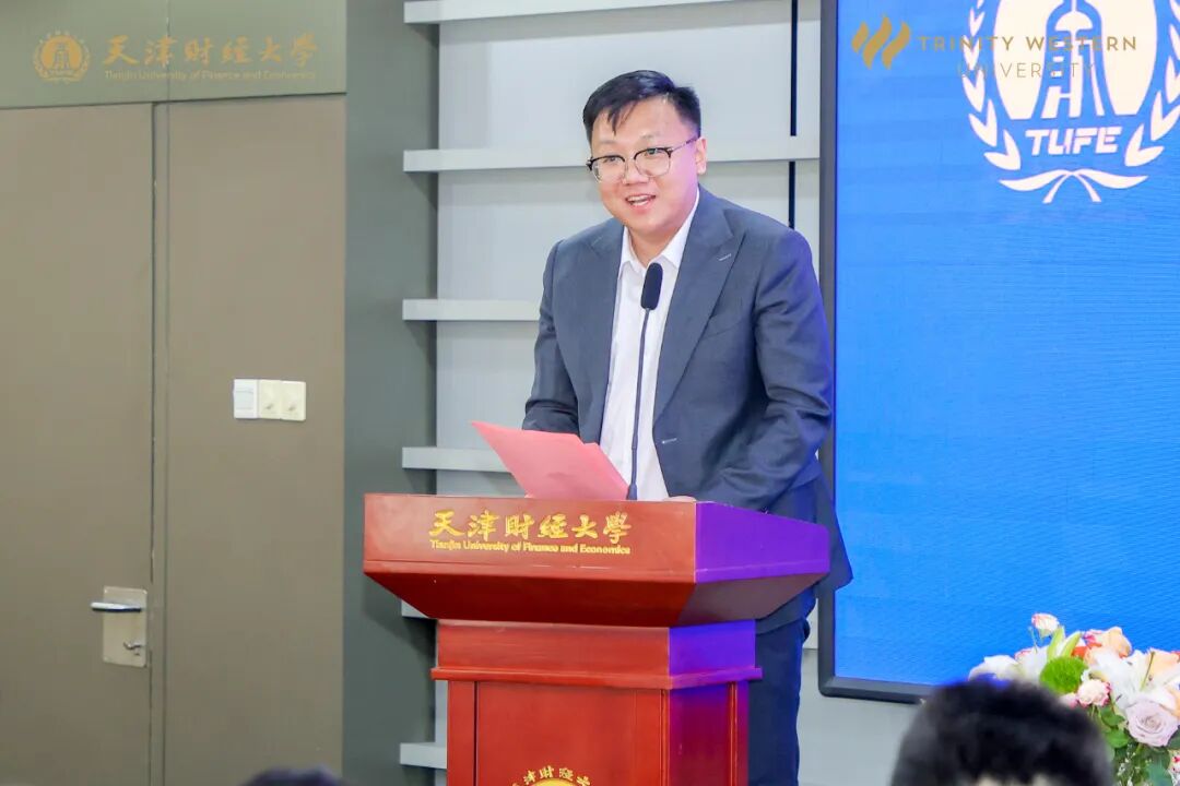典礼上,新生代表张双(Sophie)、冯泰龙(Tyrone)、辛蕊轩(Chloe)先后发言。三位新生分别来自金融、制造、科技行业,均拥有5年以上管理经验。他们表示,选择长城国际MBA,正是看中项目“中外融合”的办学特色——即依托天津财经大学的AMBA+BGA双认证优势,天津财经大学AACSB会员和西三一大学的AACSB会员院校教学资源,这种“跨文化协同”的学习平台,将帮助自己在复杂的全球经济格局中实现能力升级。新生们承诺,将践行“终身学习”理念,珍惜与同学、师长交流的机会,在知识碰撞中锤炼战略思维与跨文化协作能力。